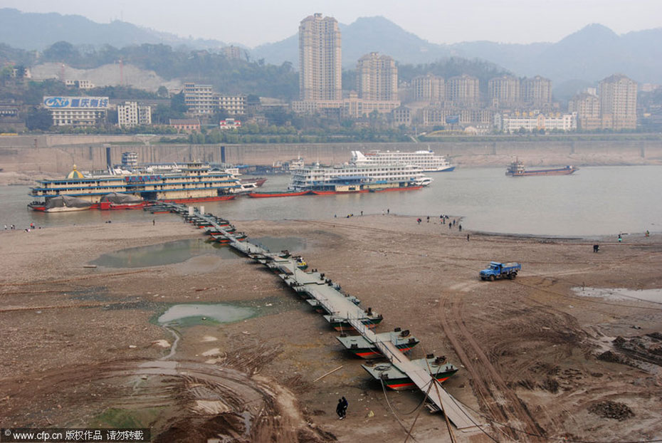 3月13日,長(zhǎng)江重慶朝天門(mén)段裸露的河灘。受西南地區(qū)干旱和三峽水庫(kù)騰庫(kù)影響,長(zhǎng)江重慶段水位持續(xù)走低,給通航安全帶來(lái)影響。劉洋/CFP