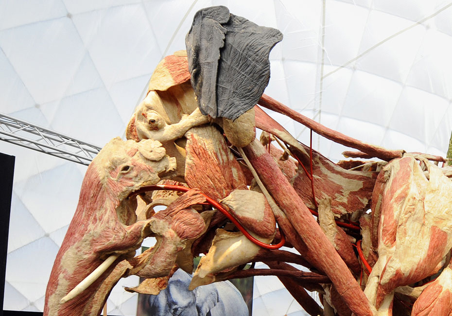 德國著名解剖學家鞏特爾·馮·哈根斯博士被稱為“死亡先生”,目前展出的是有史以來的最大的動物尸體。體型巨大的“桑芭”尸體高3.5米,重3.2噸。據悉“桑芭”將于2010年4月歸還諾因基興動物園。圖片來源:中國新聞網