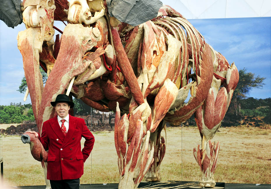德國著名解剖學家鞏特爾·馮·哈根斯博士被稱為“死亡先生”,目前展出的是有史以來的最大的動物尸體。體型巨大的“桑芭”尸體高3.5米,重3.2噸。據悉“桑芭”將于2010年4月歸還諾因基興動物園。圖片來源:中國新聞網