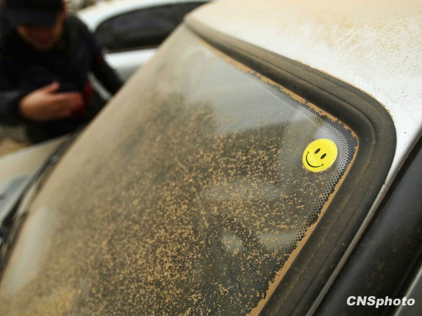 3月20日,春季首場重度浮塵天遮蓋了整個北京城。圖為一輛轎車的后車窗上布滿黃沙。中新社發 富田 攝