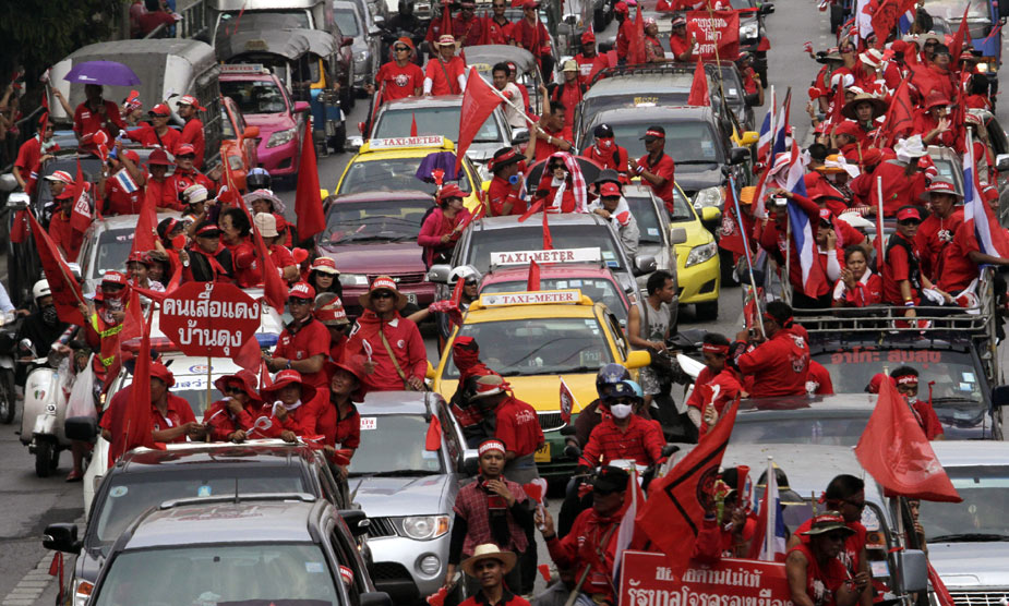 泰國紅衫軍20日號召數千輛汽車上街,在曼谷大游行,路線總長約45公里,橫跨曼谷多條主要街道,勢要癱瘓曼谷。圖片來源:中國新聞網