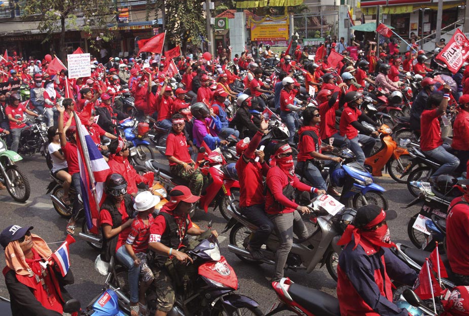 泰國紅衫軍20日號召數千輛汽車上街,在曼谷大游行,路線總長約45公里,橫跨曼谷多條主要街道,勢要癱瘓曼谷。圖片來源:中國新聞網