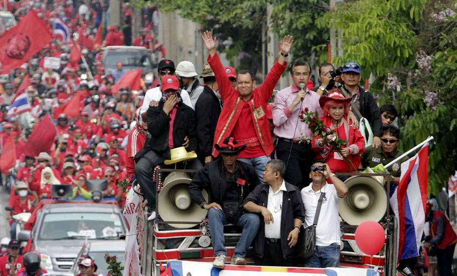 泰國紅衫軍20日號召數千輛汽車上街,在曼谷大游行,路線總長約45公里,橫跨曼谷多條主要街道,勢要癱瘓曼谷。圖片來源:中國新聞網