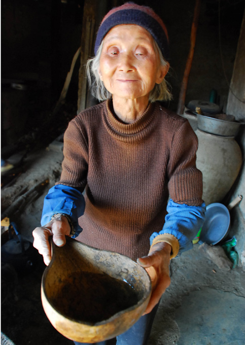 3月21日四川攀枝花仁和區87歲的施蘭英對著鏡頭說,“這是我一天的水”。中新社發 劉忠俊 攝