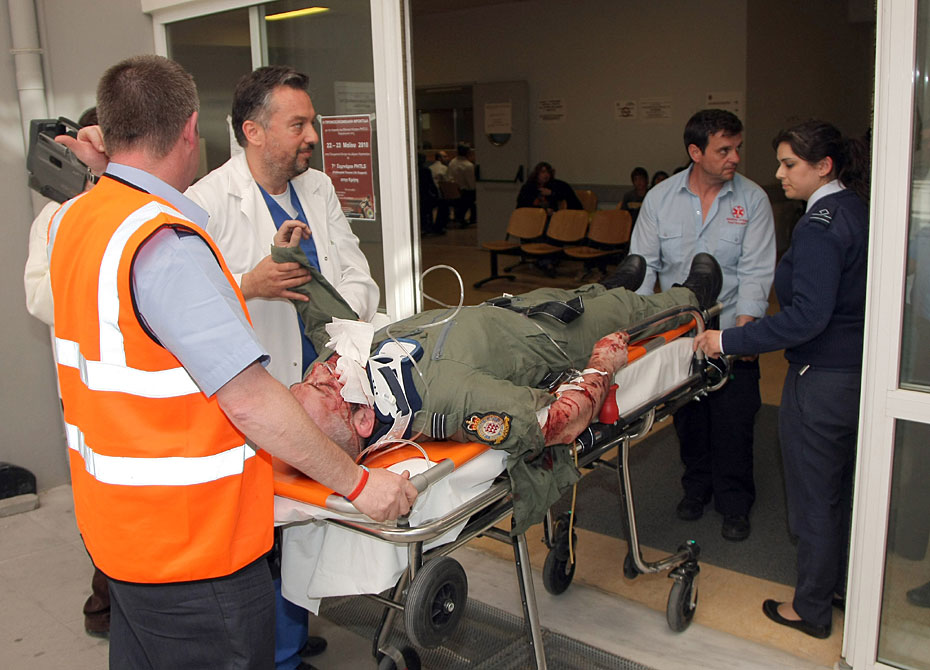 圖為英國“紅箭”特技飛行隊傷員抵達(dá)醫(yī)院接受治療。