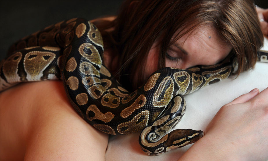 當(dāng)?shù)貢r(shí)間26日,英國一名來自于“切辛頓冒險(xiǎn)世界”的女員工為了宣傳位于萊瑟黑德的一家主題公園,擺出姿勢(shì)接受兩條黃蟒的“按摩”。圖片來源:中國新聞網(wǎng)