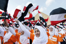 數千兒童金字塔前揮旗