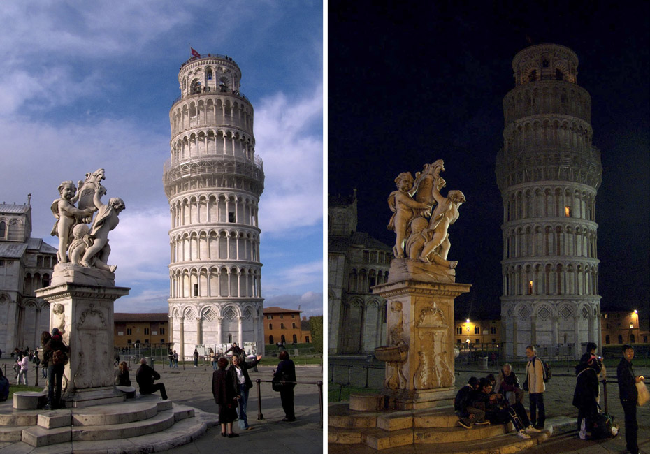 由世界自然基金會發起的“地球一小時”環;顒27日20點30分按照時區依次在全球數千個城市展開。圖為意大利比薩斜塔在熄燈前和熄燈后的景色。