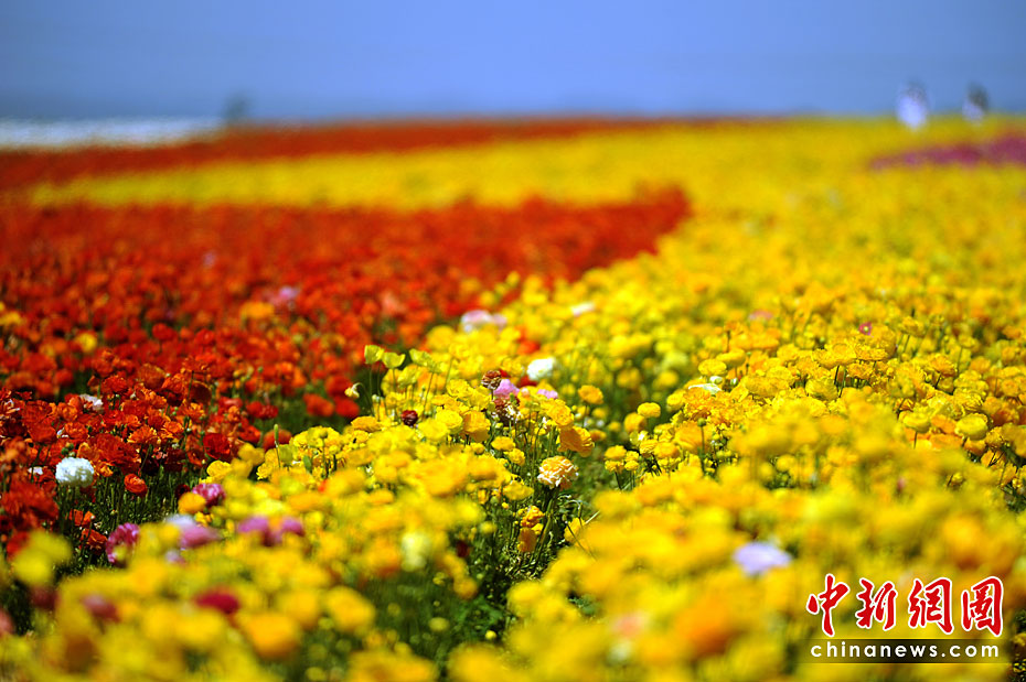 美國加利福尼亞州圣迭戈的卡爾斯巴德花田近日繁花盛開,姹紫嫣紅的花朵整齊地鋪滿在五十英畝的土地上,一望無垠的花海,美不勝收。圖片來源:中國新聞網