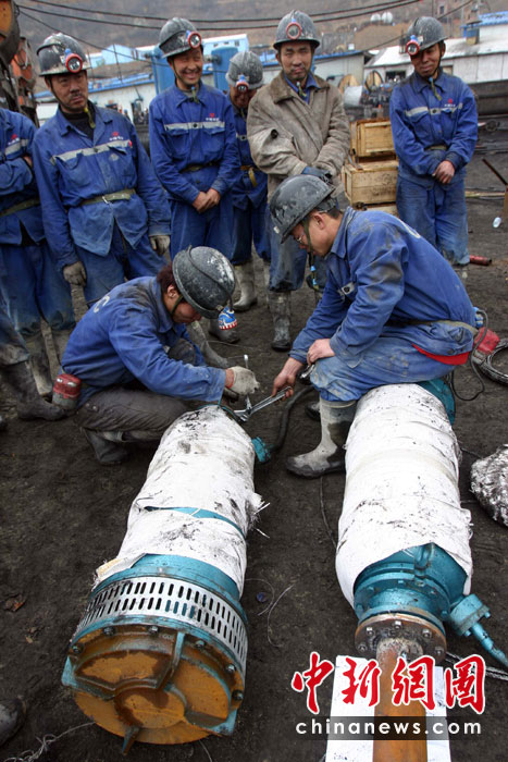 3月29日上午,山西華晉焦煤有限責任公司王家嶺煤礦透水事故搶險工作正在緊張進行中。為救援被困礦工,多方支援的搶險器材、礦山救護隊已經陸續抵達現場。圖為即將組裝完畢的水泵。中新社發 張云 攝