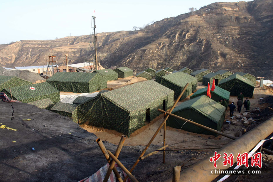 4月2日上午,記者在華晉焦煤有限公司王家?guī)X礦透水事故搶險現(xiàn)場看到搶險帳篷已在離井口50米處搭起,屆時搶險工人將在這里休整,為搜救井下礦工提供便利。中新社發(fā) 張云 攝