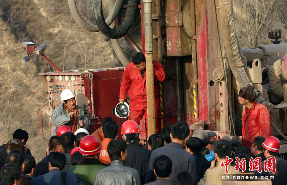 4月2日下午,華晉焦煤公司王家嶺礦透水事故搶險人員為井下有生命跡象的2號垂直鉆孔輸送營養液,并靜聽井下人員反饋回音。中新社發 張云 攝