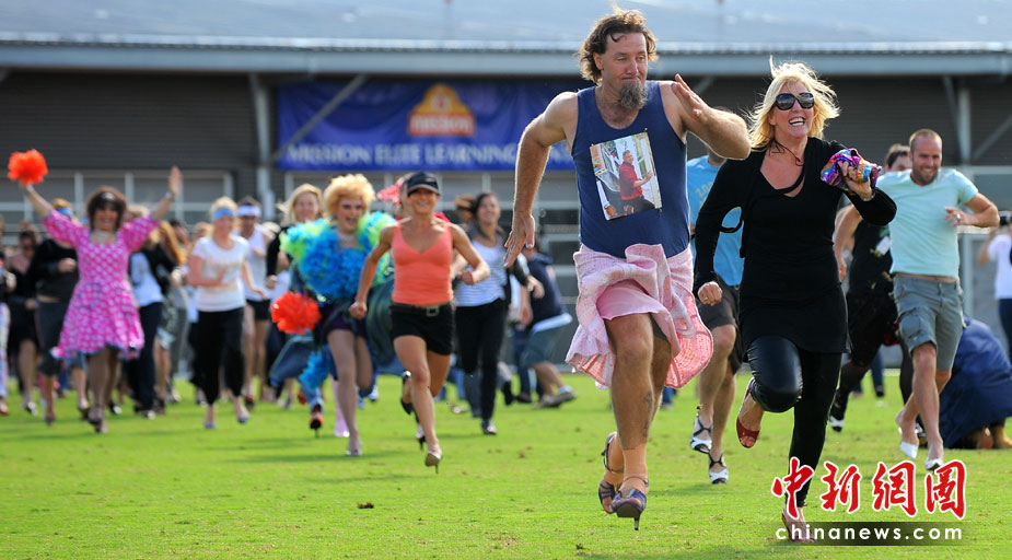 4月10日,在澳大利亞墨爾本,人們穿著高跟鞋賽跑。旨在挑戰多人穿高跟鞋賽跑的吉尼斯世界紀錄。盡管最終挑戰失敗,參賽者仍在80米的賽道上爭先恐后,各顯神通。
