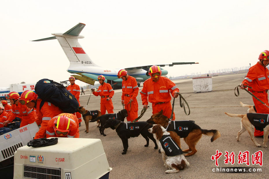 圖為4月14日下午,中國國際地震救援隊攜帶重型搜救設(shè)備搭乘空軍專機(jī)趕赴青海玉樹震區(qū)。中新社發(fā) 譚超 攝