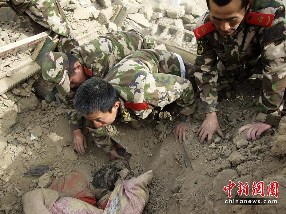 圖為4月14日11時(shí),武警玉樹支隊(duì)的戰(zhàn)士在玉樹縣結(jié)古鎮(zhèn)地震廢墟里救助被困民眾。中新社發(fā) 張守國(guó) 攝