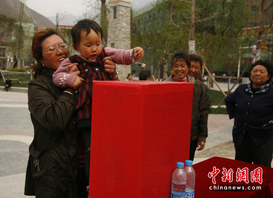 4月15日,汶川發(fā)動(dòng)各方力量向青海玉樹災(zāi)區(qū)籌集善款,汶川縣政府向村級(jí)以上單位發(fā)出捐款通知,在汶川縣鍋莊廣場(chǎng)啟動(dòng),汶川紅十字會(huì)在當(dāng)天就籌得善款5萬余元。中新社發(fā) 汶川宣傳部 供