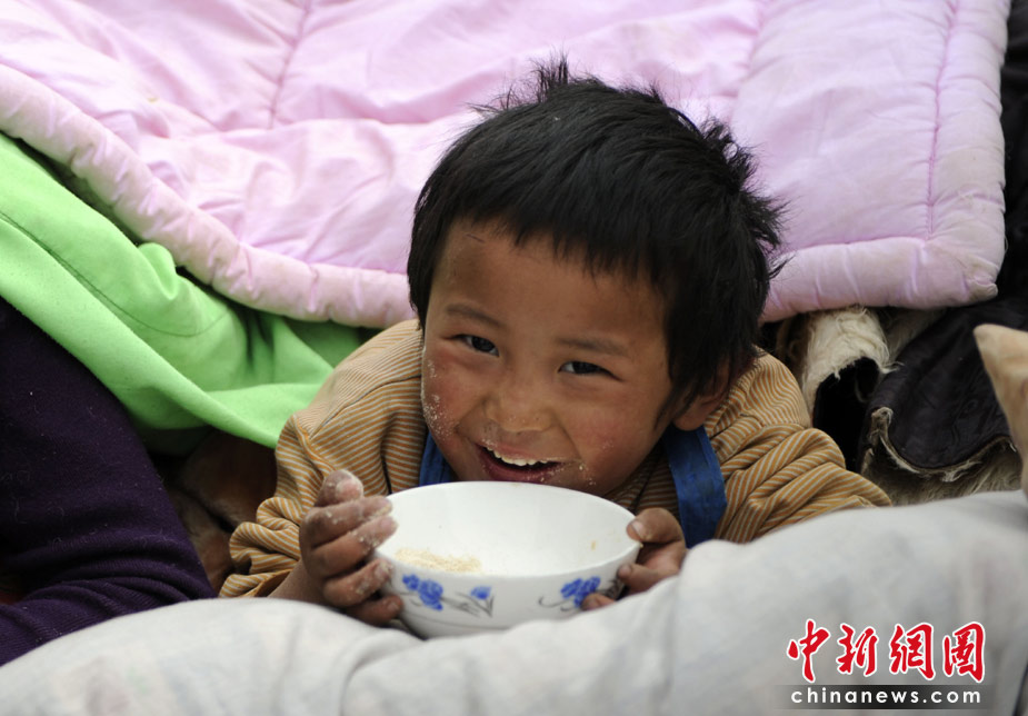 4月16日,青海玉樹體育場地震民眾安置點,一名孩童歡快地吃東西。 中新社發 廖攀 攝