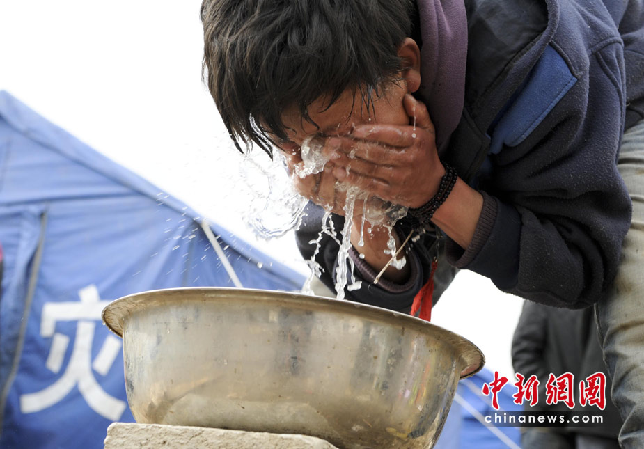 4月16日,青海玉樹(shù)體育場(chǎng)地震受災(zāi)民眾安置點(diǎn),一位居民用清水洗臉。隨著救災(zāi)物資的到位,受災(zāi)民眾生活得到基本保障。 中新社發(fā) 廖攀 攝