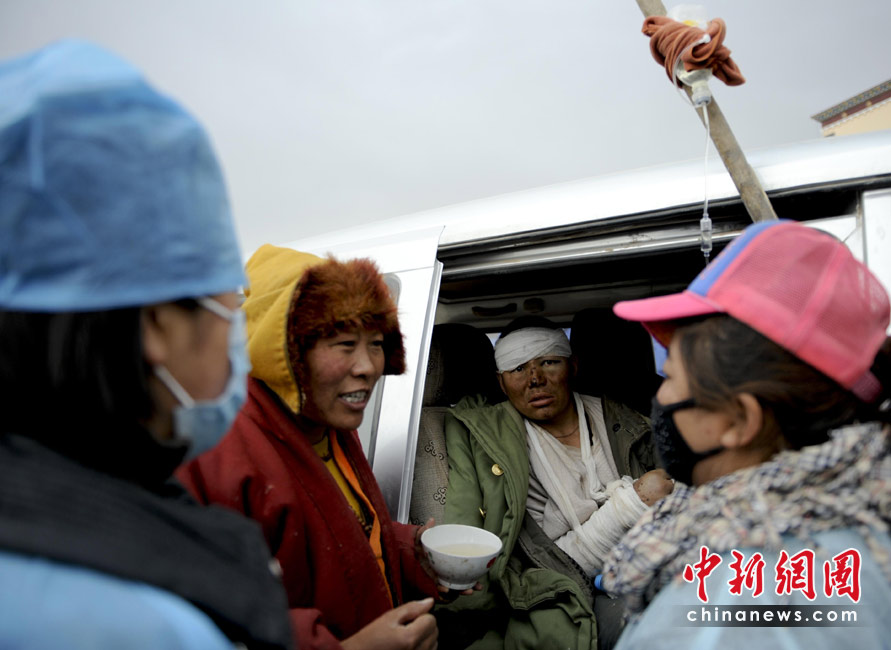 4月16日,一名地震中受傷者在青海玉樹體育場(chǎng)的車?yán)锝邮苤委煛?中新社發(fā) 廖攀 攝