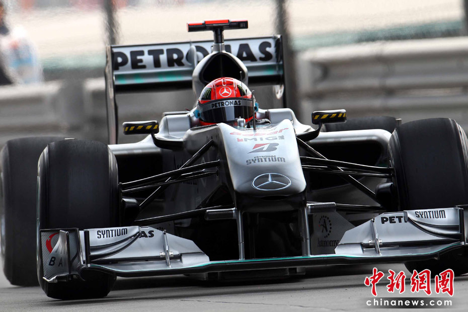 4月16日,2010國際汽聯F1世界錦標賽上海站在上海國際賽車場開始車手第一、第二次練習賽。圖為代表梅賽德斯GP車隊出戰的老車王、德國車手舒馬赫重回上海賽道。 中新社記者 任晨鳴 攝