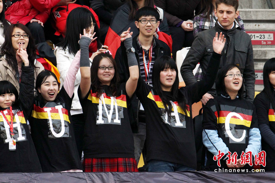 4月16日,2010國際汽聯F1世界錦標賽上海站在上海國際賽車場開始車手第一、第二次練習賽。代表梅賽德斯GP車隊出戰的老車王、德國車手舒馬赫重回上海賽道。 圖為舒馬赫的中國女粉絲在看臺上為偶像助威。 中新社記者 任晨鳴 攝