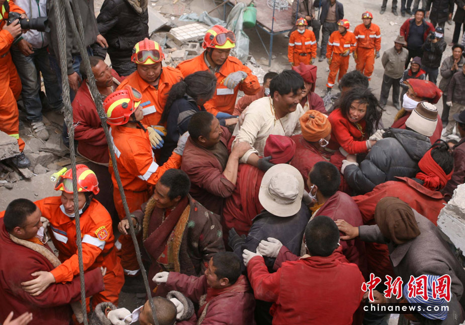 2010年4月16日13:50分左右,青海省玉樹藏族自治州玉樹縣地震發(fā)生第三天,在中心城區(qū)一垮塌賓館現(xiàn)場一名被埋54小時(shí)13歲的才珍拉姆被國家地震局應(yīng)急救援隊(duì)等成功救出。4月14日07時(shí)49分許,青海省玉樹藏族自治州玉樹縣(北緯33.1,東經(jīng)96.7)發(fā)生7.1級地震。中新社發(fā) 劉忠俊 攝