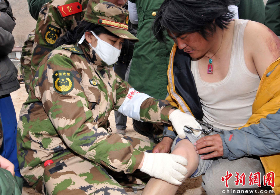 4月16日上午,廣東邊防總隊抗震救災醫療隊在青海玉樹州結古鎮民族師范學院廣場設立救治點,當日救助地震災區傷員200多名。中新社發 陳森陽 攝