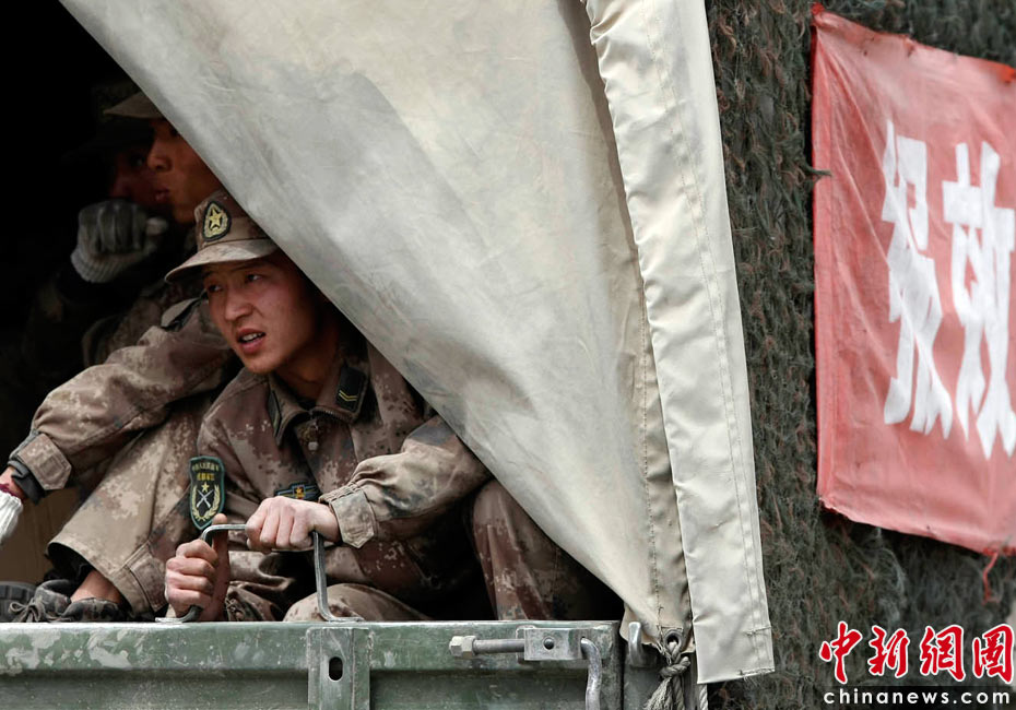 2010年4月16日,青海玉樹藏族自治州玉樹縣結古鎮,剛剛抵達的三名解放軍準備投入現場救援。中新社發 盛佳鵬 攝