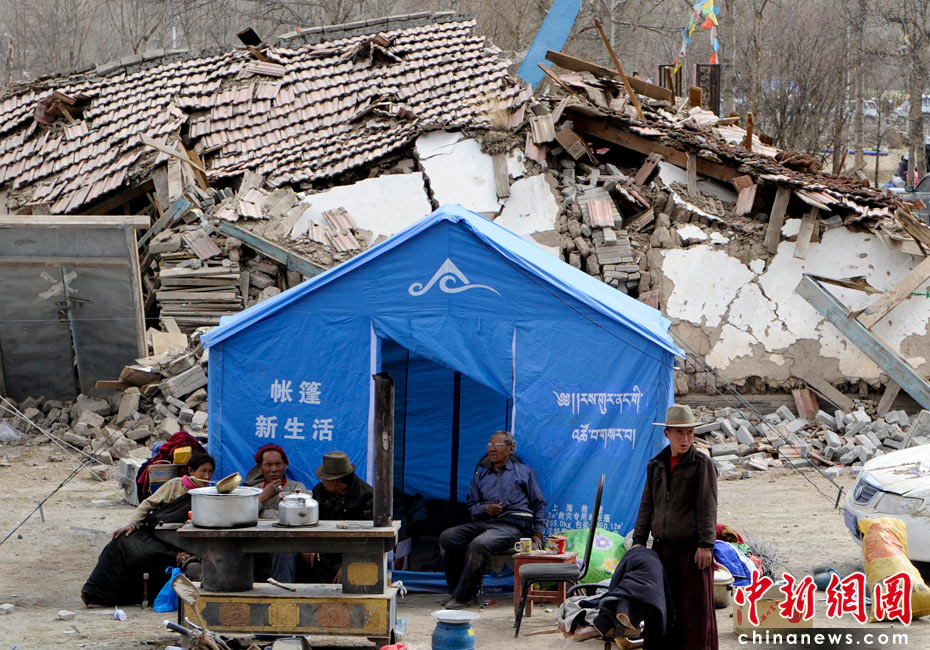 4月16日,青海玉樹衛生職業中專的受災民眾在地震廢墟前的帳篷里生活,基本生活條件得到保障。目前38000余棉帳篷正在運往災區,有超過1萬頂帳篷已經運抵。中新社發 廖攀 攝