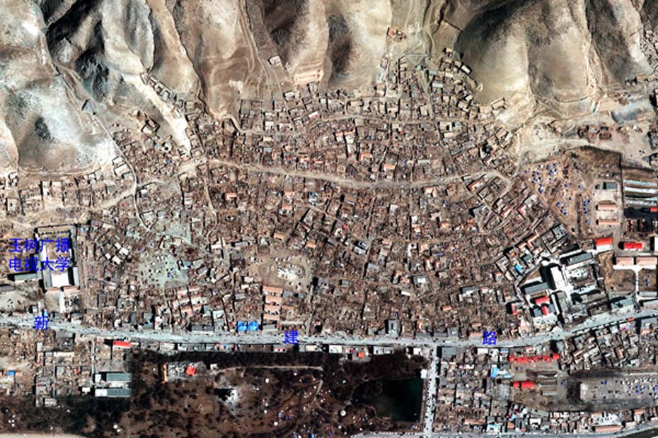 利用對地觀測中心2010年4月16日獲取的高分辨率航空遙感數(shù)據(jù),提取出玉樹州結(jié)古鎮(zhèn)城區(qū)范圍內(nèi)地震破壞最嚴(yán)重或典型地區(qū),使之與GoogleEarth中相應(yīng)位置的震前遙感衛(wèi)星數(shù)據(jù)進行對比,直觀展現(xiàn)結(jié)古鎮(zhèn)在此次地震中的受影響程度。圖片來源:中國科學(xué)院