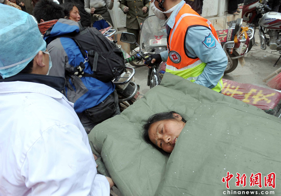4月17日13點38分許,搜救隊在玉樹結古鎮(zhèn)成功救出一名中年婦女,幸存者神志清醒,還睜著眼睛,據悉腿部、腰部受傷。中新社發(fā) 陳文 攝