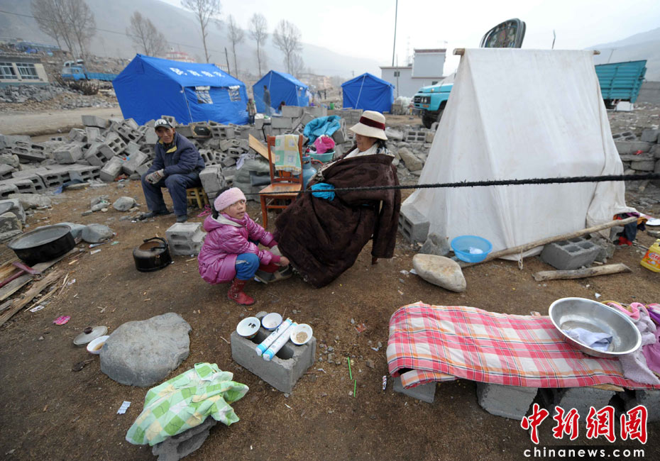 4月17日上午,青海省民政廳廳長更陽向媒體發布了一系列安撫救濟措施,災民生活補助按每人每天15元,每一個死亡人員家庭補助8000元,“三孤”指孤老、孤殘、孤兒補助每人每月1000元,孤兒補助到18歲止。圖為震區一家人和他們的全部家當。中新社發 陳文 攝