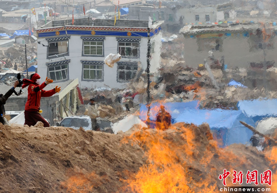 4月17日,青海省玉樹縣結(jié)古鎮(zhèn)附近的山坡上,眾多地震遇難者遺體被火葬。當(dāng)日,為妥善及時(shí)處理遇難人員遺體,預(yù)防災(zāi)區(qū)疫情的發(fā)生與流行,青海出臺地震遇難人員遺體處理意見,強(qiáng)調(diào)在處理遺體時(shí)要尊重少數(shù)民族喪葬習(xí)俗,尊重死者尊嚴(yán)。圖為眾多僧侶為逝者祈禱。中新社發(fā) 廖攀 攝