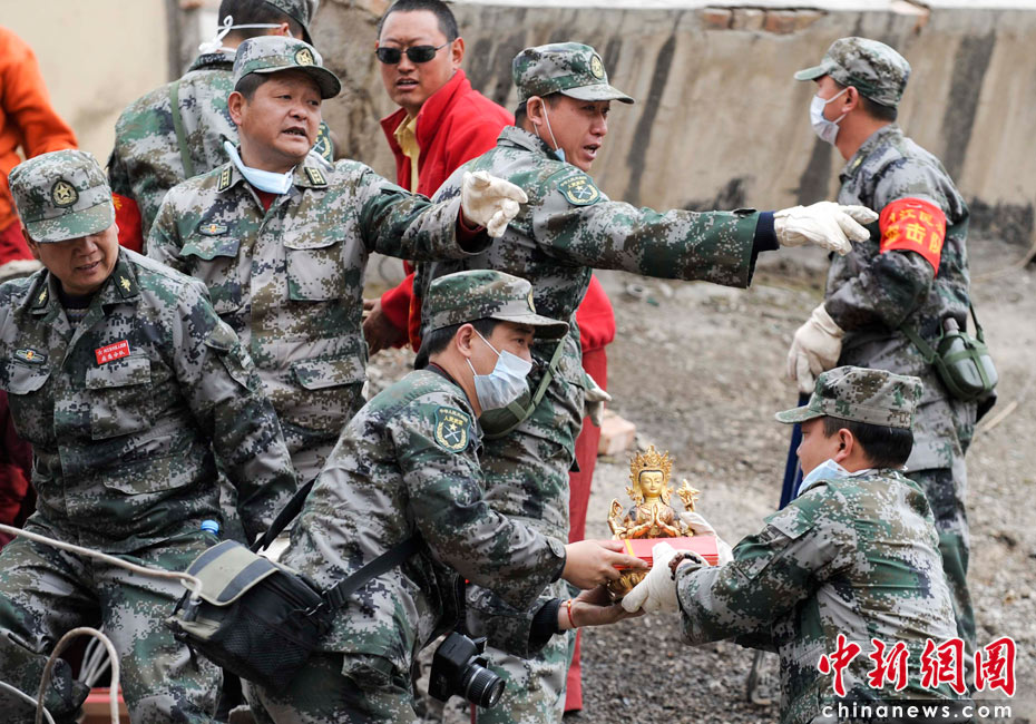 4月17日,青海玉樹結古鎮民主路,解放軍戰士為信眾清理廢墟中的法器。中新社發 廖攀 攝