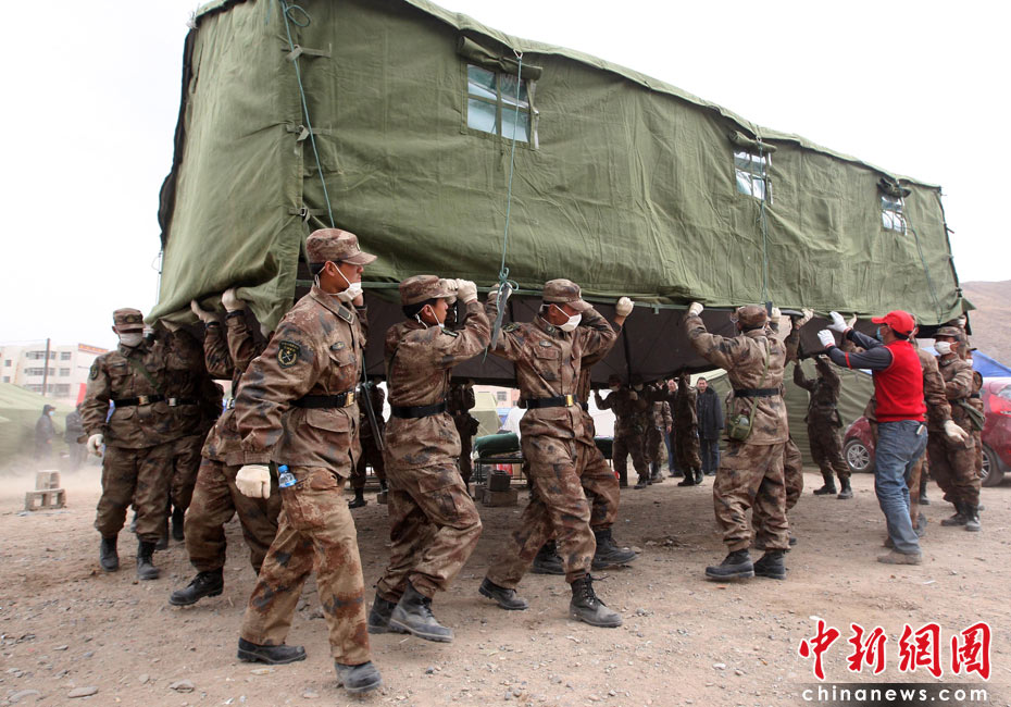 4月17日,青海玉樹體育場(chǎng)受災(zāi)民眾安置點(diǎn)內(nèi),解放軍救援隊(duì)為安置點(diǎn)整體搬遷帳篷。中新社發(fā) 盛佳鵬 攝