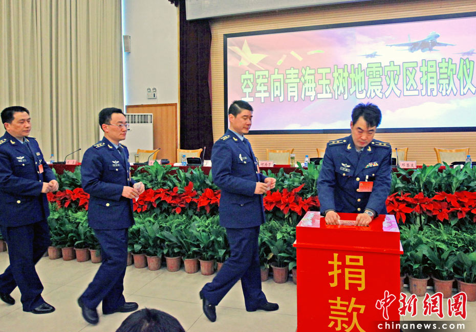 4月17日,中國空軍啟動“空軍向青海玉樹地震災區捐款儀式”,號召全空軍廣大官兵向災區人民捐款。在當天的捐款儀式上即捐款13萬多元。這些捐款將在空軍向玉樹捐款活動結束后,統一送往災區。中新社發 譚超 攝