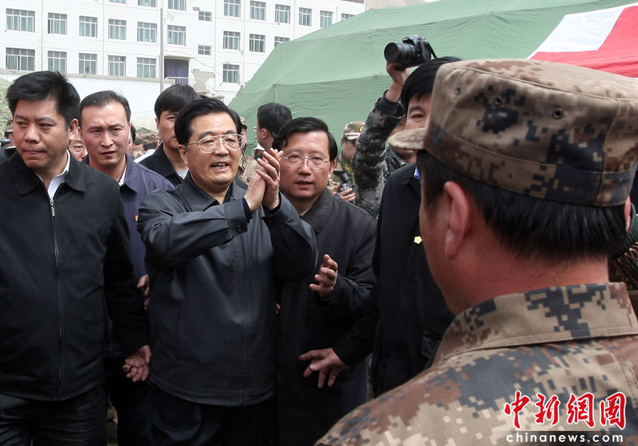 4月18日,中共中央總書記、國家主席、中央軍委主席胡錦濤飛抵玉樹,看望慰問地震災區干部群眾,實地指導抗震救災工作。中新社發 盛佳鵬 攝