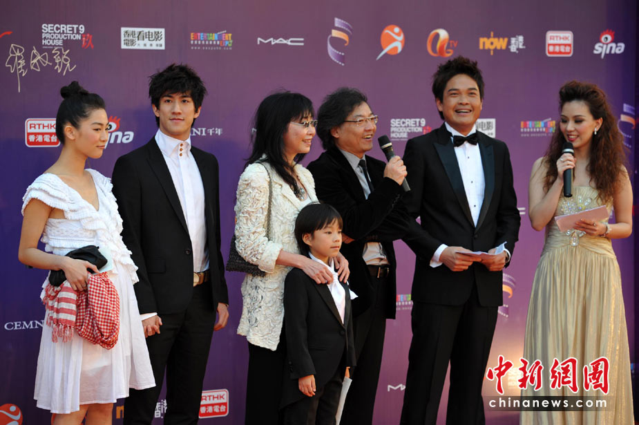 4月18日,參加第29屆香港電影金像獎頒獎典禮的舒淇、何超儀、林熙蕾、楊千女華、梁詠琪、劉家良、張家輝、張震、曾志偉、錢嘉樂、關錦鵬、余文樂、吳彥祖、馮德倫、阮經天、趙又廷、許志安、黃子華等明星,在粉絲的歡呼聲中、在媒體記者追逐中,正踏上紅地毯步入香港文化中心大劇院。城中盛事“金像獎頒獎典禮”在這舉行。圖為《歲月神偷》導演與主要角色。中新社發 鄭祚聲 攝