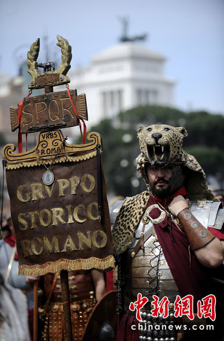 4月18日,意大利羅馬,男子打扮成武士在圓形競(jìng)技場(chǎng)附近參加游行,慶祝羅馬建城2763周年。圖片來源:中國(guó)新聞網(wǎng)