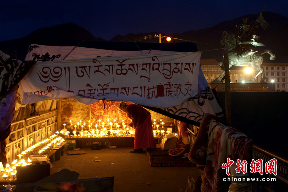 2010年4月18日,青海玉樹結(jié)古鎮(zhèn)格薩爾王廣場(chǎng),雪域阿日香巴拉凈土五明佛學(xué)院搭建了帳篷,免費(fèi)為民眾提供酥油燈,為地震遇難者祈禱。中新社發(fā) 盛佳鵬 攝