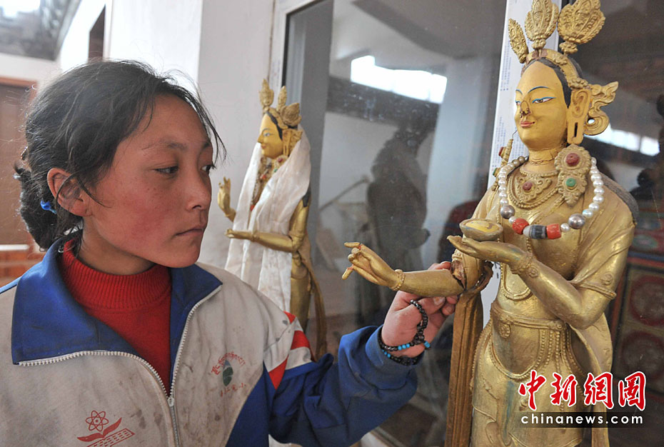 4月19日,新聞記者首次進入青海玉樹7.1級強烈地震的震中點上拉秀鄉日麻村,奇跡是全村無一傷亡,位于村中心、正在新修的查榮寺里,兩尊文成公主的塑像局部損壞。中新社發 賈國榮 攝