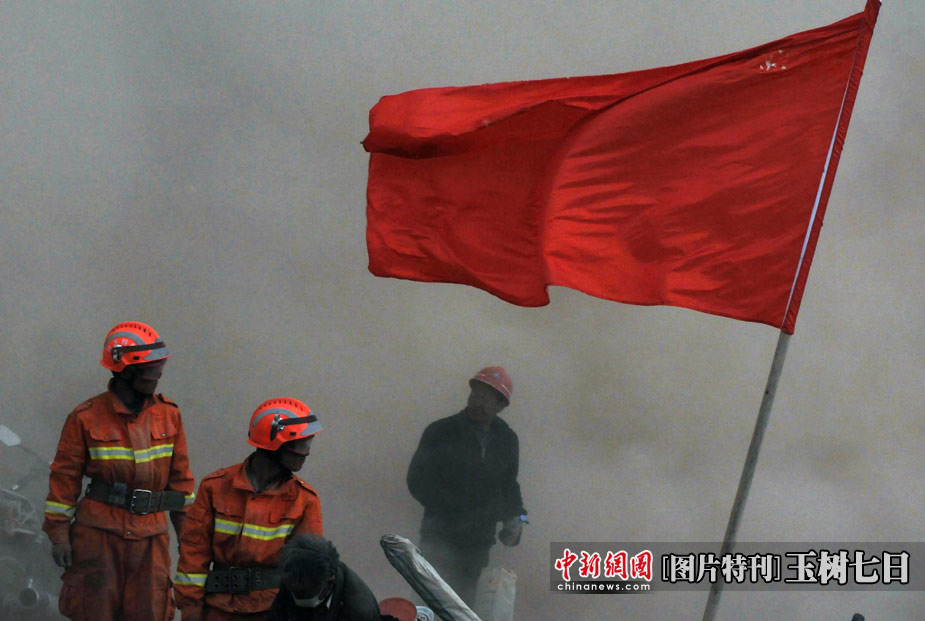 4月20日,青海玉樹地震災區風沙迷漫,各地救援隊在結古鎮災區煙塵中堅持抗震救災。中新社發 盛佳鵬 攝