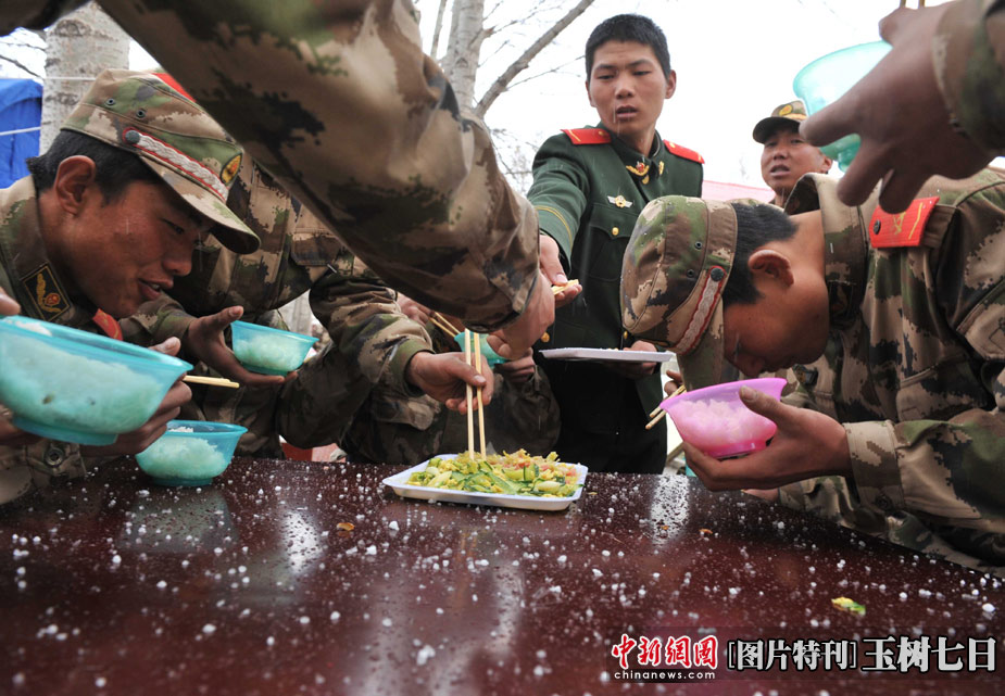 4月20日中午時分,玉樹地震災(zāi)區(qū)突然雷雹交加,正在現(xiàn)場救援的青海武警總隊(duì)官兵只能在冰雹中吃午餐。中新社發(fā) 賈國榮 攝