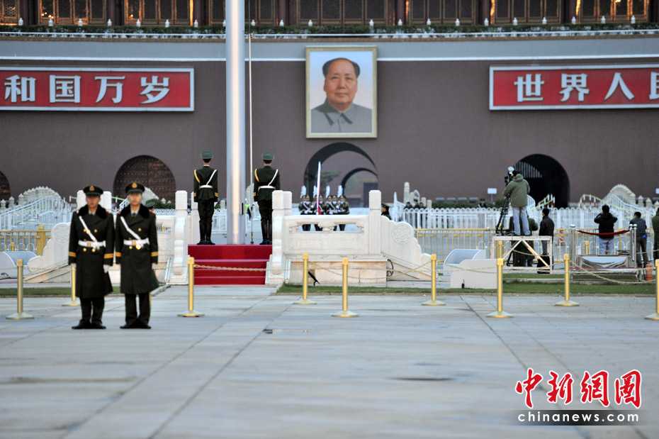 升旗儀式在清晨5:30左右進(jìn)行,國(guó)旗升上旗桿頂部后,再向下降至半旗。