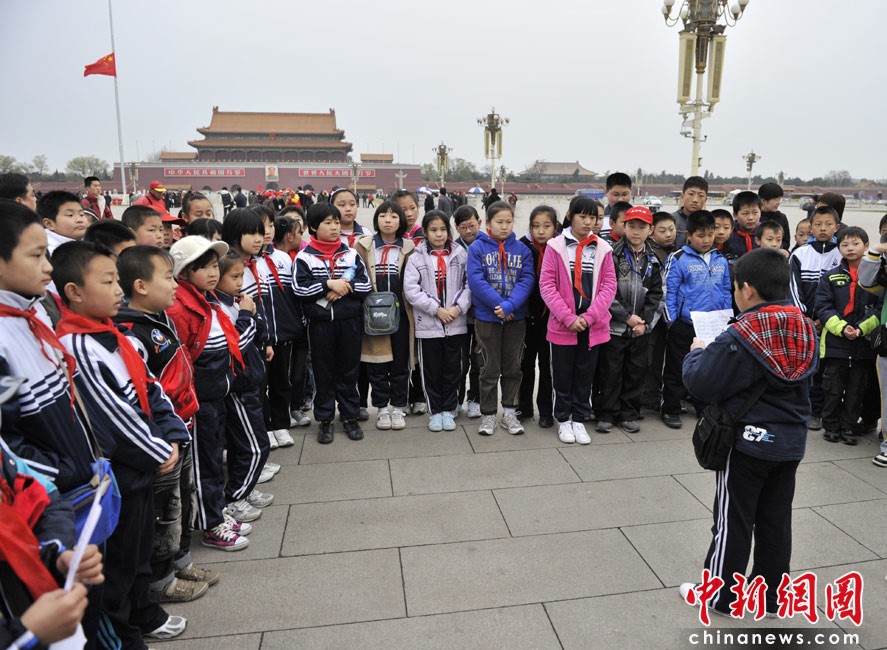 4月21日清晨,廊坊第十二小學的小學生來到天安門廣場朗讀自己的作文悼念青海玉樹地震的遇難同胞。中新網(wǎng)記者 金碩 攝