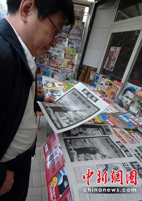 4月21日,按照中國國務院決定,舉行全國哀悼活動,全國和駐外使領館下半旗志哀,停止公共娛樂活動。當日北京各家報社刊出悼念玉樹地震遇難同胞特刊,并撤銷了一切彩色圖片和字頭,采用黑白版面。中新社發 鄒憲 攝