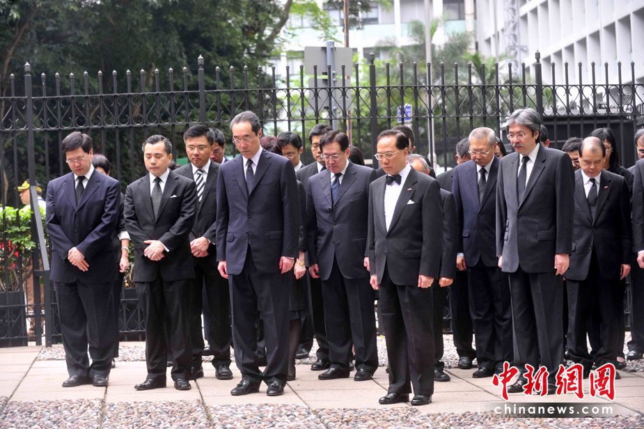 4月21日,配合全國哀悼青海玉樹地震遇難同胞,香港特別行政區所有政府機構下半旗致哀,行政長官曾蔭權率領政府高層人員,在政府總部默哀。中新社發 譚達明 攝