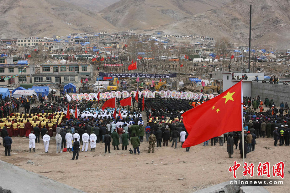 4月21日,為表達全國各族人民對青海玉樹地震遇難同胞的深切哀悼,中國國務院決定,舉行全國哀悼活動。圖為青海玉樹當地民眾在玉樹縣結古鎮鎮政府舉行哀悼活動。中新社發 蘇丹 攝