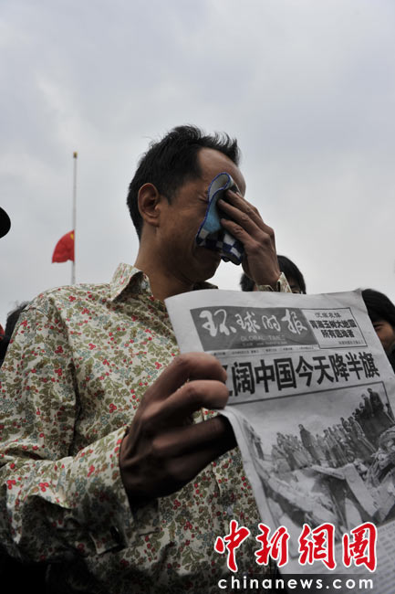 4月21日,為表達全國各族人民對青海玉樹地震遇難同胞的深切哀悼,中國國務院決定,舉行全國哀悼活動,全國和駐外使領館下半旗志哀,停止公共娛樂活動。圖為北京天安門廣場上哀悼遇難者的民眾。中新網記者 金碩 攝