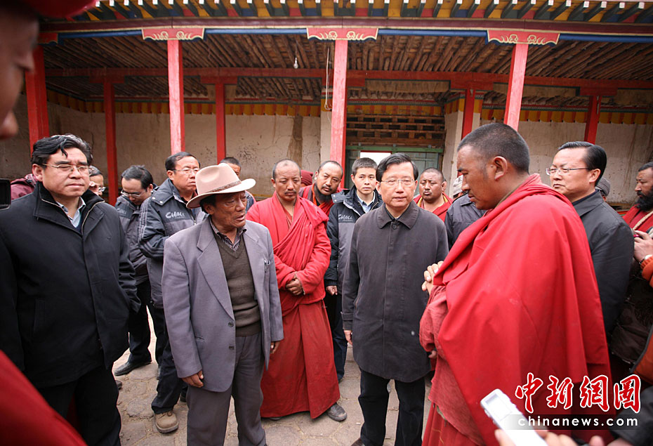 4月21日,青海省委書(shū)記強(qiáng)衛(wèi)來(lái)到玉樹(shù)縣結(jié)古鎮(zhèn)結(jié)古寺,親切看望慰問(wèn)受災(zāi)僧侶,并詳細(xì)了解了結(jié)古寺受災(zāi)情,強(qiáng)衛(wèi)對(duì)寺管會(huì)在地震發(fā)生后參與抗震救災(zāi)給予了高度評(píng)價(jià)。中新社發(fā) 劉忠俊 攝